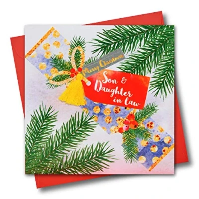 DIMENSIONS: 150x150mm CAPTION: Son and Daughter in law, Happy Christmas EMBELLISHMENT: Yellow Tassel BLANK INSIDE: Space inside for your own message MADE IN THE UK: Designed, printed and finished in the UK HIGH-QUALITY: Printed on top quality heavy 350gsm card stock, with envelope included SUSTAINABLE: Comes wrapped in Compostable bag or with a card catch label. Both the greetings card & envelope are sustainably sourced and recyclable STANDARD LETTER SIZE: Can be sent with Royal Mail standard letter stamps