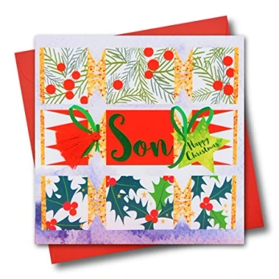 Claire Giles Greeting Cards, Happy Christmas Son Card, Crackers design, Embellished with a Colourful Tassel