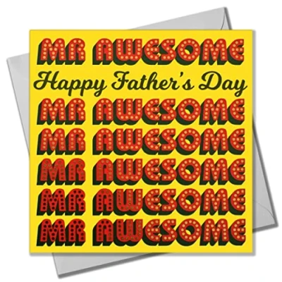 DIMENSIONS: 150x150mm CAPTION: Mr Awesome, Happy Father's Day EMBELLISHMENT: Foil detail with Shiny Gold BLANK INSIDE: Space inside for your own message MADE IN THE UK: Designed, printed and finished in the UK HIGH-QUALITY: Printed on top quality heavy 350gsm card stock, with envelope included SUSTAINABLE: Comes wrapped in Compostable bag or with a card catch label. Both the greetings card & envelope are sustainably sourced and recyclable STANDARD LETTER SIZE: Can be sent with Royal Mail standard letter stamps
