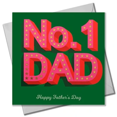 DIMENSIONS: 150x150mm CAPTION: No. 1 Dad, Happy Father's Day EMBELLISHMENT: Foil detail with Shiny Gold BLANK INSIDE: Space inside for your own message MADE IN THE UK: Designed, printed and finished in the UK HIGH-QUALITY: Printed on top quality heavy 350gsm card stock, with envelope included SUSTAINABLE: Comes wrapped in Compostable bag or with a card catch label. Both the greetings card & envelope are sustainably sourced and recyclable STANDARD LETTER SIZE: Can be sent with Royal Mail standard letter stamps