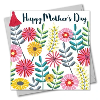Claire Giles Greeting Cards, Happy Mother's Day Card, Flowers & Leaves Design Mothering Sunday Embellished with a Colourful Tassel