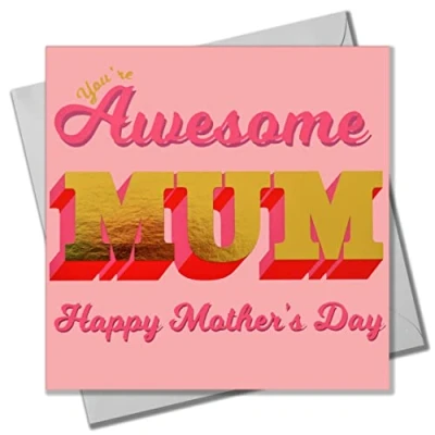 DIMENSIONS: 150x150mm CAPTION: You're Awesome Mum, Happy Mother's Day EMBELLISHMENT: Foil detail with Shiny Gold BLANK INSIDE: Space inside for your own message MADE IN THE UK: Designed, printed and finished in the UK HIGH-QUALITY: Printed on top quality heavy 350gsm card stock, with envelope included SUSTAINABLE: Comes wrapped in Compostable bag or with a card catch label. Both the greetings card & envelope are sustainably sourced and recyclable STANDARD LETTER SIZE: Can be sent with Royal Mail standard letter stamps
