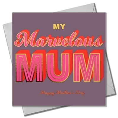 DIMENSIONS: 150x150mm CAPTION: My Marvelous Mum, Happy Mother's Day EMBELLISHMENT: Foil detail with Shiny Gold BLANK INSIDE: Space inside for your own message MADE IN THE UK: Designed, printed and finished in the UK HIGH-QUALITY: Printed on top quality heavy 350gsm card stock, with envelope included SUSTAINABLE: Comes wrapped in Compostable bag or with a card catch label. Both the greetings card & envelope are sustainably sourced and recyclable STANDARD LETTER SIZE: Can be sent with Royal Mail standard letter stamps