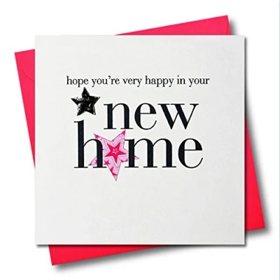 DIMENSIONS: 150x150mm CAPTION: hope you're very happy in your new home EMBELLISHMENT: Padded Silver Star BLANK INSIDE: Space inside for your own message MADE IN THE UK: Designed, printed and finished in the UK HIGH-QUALITY: Printed on top quality heavy 350gsm card stock, with envelope included SUSTAINABLE: Comes wrapped in Compostable bag or with a card catch label. Both the greetings card & envelope are sustainably sourced and recyclable STANDARD LETTER SIZE: Can be sent with Royal Mail standard letter stamps