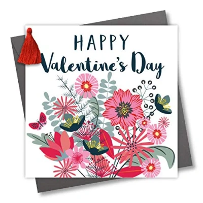 Claire Giles Greeting Cards, Happy Valentine's Day Card, Bouquet Design Love Embellished with a Colourful Tassel