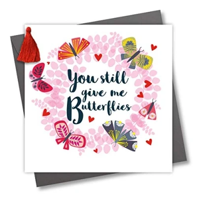 DIMENSIONS: 150x150mm CAPTION: You Still Give me Butterflies EMBELLISHMENT: Red Tassel BLANK INSIDE: Space inside for your own message MADE IN THE UK: Designed, printed and finished in the UK HIGH-QUALITY: Printed on top quality heavy 350gsm card stock, with envelope included SUSTAINABLE: Comes wrapped in Compostable bag or with a card catch label. Both the greetings card & envelope are sustainably sourced and recyclable STANDARD LETTER SIZE: Can be sent with Royal Mail standard letter stamps