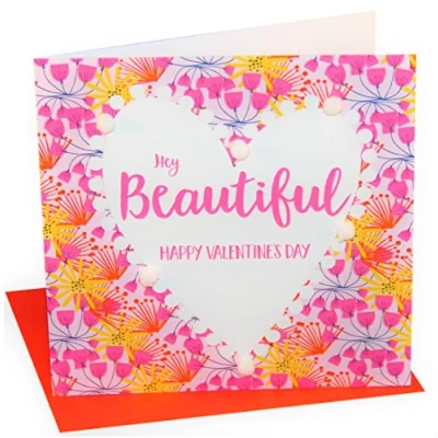 DIMENSIONS: 150x150mm CAPTION: Hey Beautiful, Happy Valentine's Day EMBELLISHMENT: Colourful Pompoms BLANK INSIDE: Space inside for your own message MADE IN THE UK: Designed, printed and finished in the UK HIGH-QUALITY: Printed on top quality heavy 350gsm card stock, with envelope included SUSTAINABLE: Comes wrapped in Compostable bag or with a card catch label. Both the greetings card & envelope are sustainably sourced and recyclable STANDARD LETTER SIZE: Can be sent with Royal Mail standard letter stamps