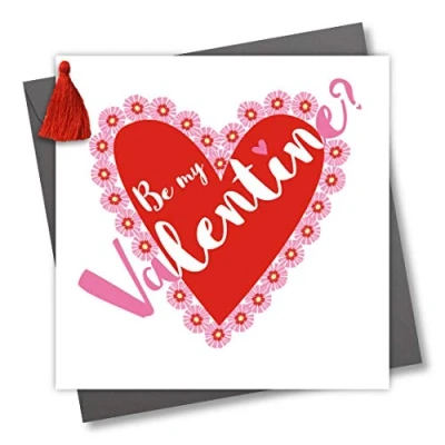 DIMENSIONS: 150x150mm CAPTION: Be my Valentine? EMBELLISHMENT: Red Tassel BLANK INSIDE: Space inside for your own message MADE IN THE UK: Designed, printed and finished in the UK HIGH-QUALITY: Printed on top quality heavy 350gsm card stock, with envelope included SUSTAINABLE: Comes wrapped in Compostable bag or with a card catch label. Both the greetings card & envelope are sustainably sourced and recyclable STANDARD LETTER SIZE: Can be sent with Royal Mail standard letter stamps