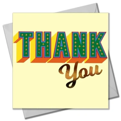 DIMENSIONS: 150x150mm CAPTION: Thank you EMBELLISHMENT: Foil detail with Shiny Gold BLANK INSIDE: Space inside for your own message MADE IN THE UK: Designed, printed and finished in the UK HIGH-QUALITY: Printed on top quality heavy 350gsm card stock, with envelope included SUSTAINABLE: Comes wrapped in Compostable bag or with a card catch label. Both the greetings card & envelope are sustainably sourced and recyclable STANDARD LETTER SIZE: Can be sent with Royal Mail standard letter stamps