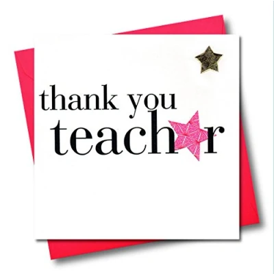 DIMENSIONS: 150x150mm CAPTION: Thank you teacher EMBELLISHMENT: Gold Padded Star BLANK INSIDE: Space inside for your own message MADE IN THE UK: Designed, printed and finished in the UK HIGH-QUALITY: Printed on top quality heavy 350gsm card stock, with envelope included SUSTAINABLE: Comes wrapped in Compostable bag or with a card catch label. Both the greetings card & envelope are sustainably sourced and recyclable STANDARD LETTER SIZE: Can be sent with Royal Mail standard letter stamps