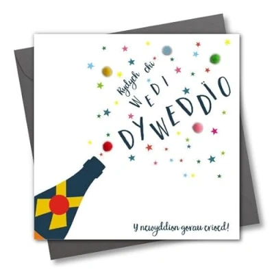 HIGH-QUALITY AND SUSTAINABLE: These 150mm x 150mm Welsh Language cards are printed on top quality heavy sustainable card stock. Both the greetings card & envelope are recyclable. CAPTION: Rydych chi wedi dyweddio! Y newyddion gorau erioed!, ENGLISH TRANSLATION: You're Engaged - Best News Ever MADE IN THE UK: Designed, printed and finished in the UK, and embellished with colourful pompoms. BLANK INSIDE FOR YOUR HAND-WRITTEN MESSAGE: These cards have plenty of blank space inside, making it easy to add your own hand-written messages. ENVELOPE INCLUDED AND COMPOSTABLE POLYBAG: They come complete with a quality envelope, and individually wrapped in a biodegradable compostable poly bag. Can be sent with Royal Mail standard letter stamps