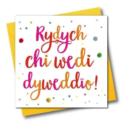 HIGH-QUALITY AND SUSTAINABLE: These 150mm x 150mm Welsh Language cards are printed on top quality heavy sustainable card stock. Both the greetings card & envelope are recyclable. CAPTION: Rydych chi wedi dyweddio!, ENGLISH TRANSLATION: You're Tying the Knot - Yay! MADE IN THE UK: Designed, printed and finished in the UK, and embellished with colourful pompoms. BLANK INSIDE FOR YOUR HAND-WRITTEN MESSAGE: These cards have plenty of blank space inside, making it easy to add your own hand-written messages. ENVELOPE INCLUDED AND COMPOSTABLE POLYBAG: They come complete with a quality envelope, and individually wrapped in a biodegradable compostable poly bag. Can be sent with Royal Mail standard letter stamps