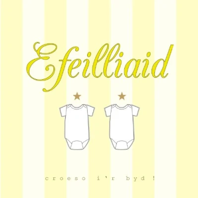 Claire Giles Greeting Cards, Welsh Baby Twin Card, Efeilliaid, Yellow Stripes, Hello Twins