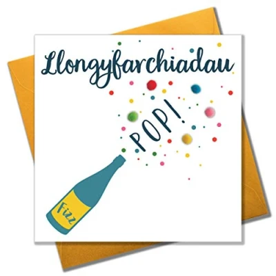 Claire Giles Greeting Cards, Welsh Congratulations Card, Llongyfarchiadau, Pop Fizz Design Well Done Pompom Embellished