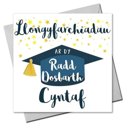 DIMENSIONS: 150x150mm CAPTION: Llongyfarchiadau ar dy Radd Dosbarth Cyntaf ENGLISH TRANSLATION: Congratulations on your First class Degree EMBELLISHMENT: Yellow Tassel BLANK INSIDE: Space inside for your own message MADE IN THE UK: Designed, printed and finished in the UK HIGH-QUALITY: Printed on top quality heavy 350gsm card stock, with envelope included SUSTAINABLE: Comes wrapped in Compostable bag or with a card catch label. Both the greetings card & envelope are sustainably sourced and recyclable STANDARD LETTER SIZE: Can be sent with Royal Mail standard letter stamps