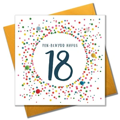 DIMENSIONS: 150x150mm CAPTION: Penblwydd Hapus 18 ENGLISH TRANSLATION: 18th EMBELLISHMENT: Colourful Pompoms BLANK INSIDE: Space inside for your own message MADE IN THE UK: Designed, printed and finished in the UK HIGH-QUALITY: Printed on top quality heavy 350gsm card stock, with envelope included SUSTAINABLE: Comes wrapped in Compostable bag or with a card catch label. Both the greetings card & envelope are sustainably sourced and recyclable STANDARD LETTER SIZE: Can be sent with Royal Mail standard letter stamps