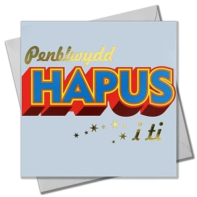 DIMENSIONS: 150x150mm CAPTION: Penblwydd Hapus i ti ENGLISH TRANSLATION: Happy Birthday to you EMBELLISHMENT: Foil detail with Shiny Gold BLANK INSIDE: Space inside for your own message MADE IN THE UK: Designed, printed and finished in the UK HIGH-QUALITY: Printed on top quality heavy 350gsm card stock, with envelope included SUSTAINABLE: Comes wrapped in Compostable bag or with a card catch label. Both the greetings card & envelope are sustainably sourced and recyclable STANDARD LETTER SIZE: Can be sent with Royal Mail standard letter stamps