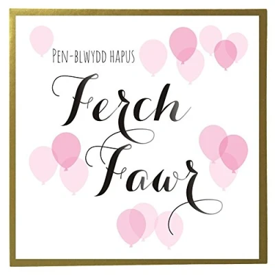 DIMENSIONS: 150x150mm CAPTION: Pen-blwydd Hapus Ferch Fawr ENGLISH TRANSLATION: Happy Birthday Birthday Girl BLANK INSIDE: Space inside for your own message MADE IN THE UK: Designed, printed and finished in the UK HIGH-QUALITY: Printed on top quality heavy 350gsm card stock, with envelope included SUSTAINABLE: Comes wrapped in Compostable bag or with a card catch label. Both the greetings card & envelope are sustainably sourced and recyclable STANDARD LETTER SIZE: Can be sent with Royal Mail standard letter stamps