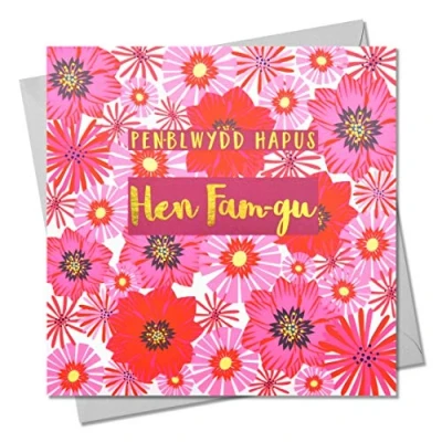 DIMENSIONS: 150x150mm CAPTION: Penblwydd Hapus Hen Fam-gu ENGLISH TRANSLATION: Happy Birthday Great Grandma EMBELLISHMENT: Foil detail with Shiny Gold BLANK INSIDE: Space inside for your own message MADE IN THE UK: Designed, printed and finished in the UK HIGH-QUALITY: Printed on top quality heavy 350gsm card stock, with envelope included SUSTAINABLE: Comes wrapped in Compostable bag or with a card catch label. Both the greetings card & envelope are sustainably sourced and recyclable STANDARD LETTER SIZE: Can be sent with Royal Mail standard letter stamps