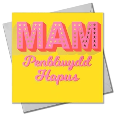 Claire Giles Greeting Cards, Welsh Happy Birthday Mam Card, Penblwydd Hapus Mam, Pink on Yellow and gold foil