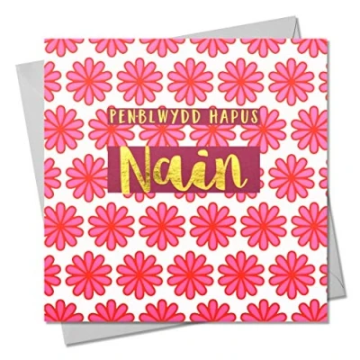 DIMENSIONS: 150x150mm CAPTION: Penblwydd Hapus Nain ENGLISH TRANSLATION: Happy Birthday Nan EMBELLISHMENT: Foil detail with Shiny Gold BLANK INSIDE: Space inside for your own message MADE IN THE UK: Designed, printed and finished in the UK HIGH-QUALITY: Printed on top quality heavy 350gsm card stock, with envelope included SUSTAINABLE: Comes wrapped in Compostable bag or with a card catch label. Both the greetings card & envelope are sustainably sourced and recyclable STANDARD LETTER SIZE: Can be sent with Royal Mail standard letter stamps