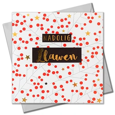 DIMENSIONS: 150x150mm CAPTION: Nadolig Llawen ENGLISH TRANSLATION: Happy Christmas EMBELLISHMENT: Foil detail with Shiny Gold BLANK INSIDE: Space inside for your own message MADE IN THE UK: Designed, printed and finished in the UK HIGH-QUALITY: Printed on top quality heavy 350gsm card stock, with envelope included SUSTAINABLE: Comes wrapped in Compostable bag or with a card catch label. Both the greetings card & envelope are sustainably sourced and recyclable STANDARD LETTER SIZE: Can be sent with Royal Mail standard letter stamps