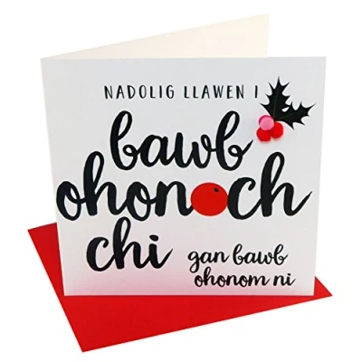 DIMENSIONS: 150x150mm CAPTION: Nadolig Llawen i bawb ohonoch chi gan bawb ohonom ni ENGLISH TRANSLATION: Happy Christmas to All of you from All of us EMBELLISHMENT: Colourful Pompoms BLANK INSIDE: Space inside for your own message MADE IN THE UK: Designed, printed and finished in the UK HIGH-QUALITY: Printed on top quality heavy 350gsm card stock, with envelope included SUSTAINABLE: Comes wrapped in Compostable bag or with a card catch label. Both the greetings card & envelope are sustainably sourced and recyclable STANDARD LETTER SIZE: Can be sent with Royal Mail standard letter stamps