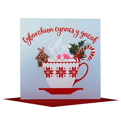 DIMENSIONS: 150x150mm CAPTION: Cyfarchion cynnes y gaeaf ENGLISH TRANSLATION: Warm winter wishes EMBELLISHMENT: Colourful Pompoms BLANK INSIDE: Space inside for your own message MADE IN THE UK: Designed, printed and finished in the UK HIGH-QUALITY: Printed on top quality heavy 350gsm card stock, with envelope included SUSTAINABLE: Comes wrapped in Compostable bag or with a card catch label. Both the greetings card & envelope are sustainably sourced and recyclable STANDARD LETTER SIZE: Can be sent with Royal Mail standard letter stamps