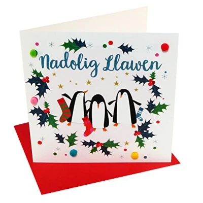 Claire Giles Greeting Cards, Welsh Happy Christmas Card, Nadolig Llawen, Penguins design xmas Embellished with Colourful Pompoms