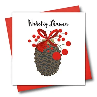 DIMENSIONS: 150x150mm CAPTION: Nadolig Llawen ENGLISH TRANSLATION: Merry Christmas EMBELLISHMENT: Red Tassel BLANK INSIDE: Space inside for your own message MADE IN THE UK: Designed, printed and finished in the UK HIGH-QUALITY: Printed on top quality heavy 350gsm card stock, with envelope included SUSTAINABLE: Comes wrapped in Compostable bag or with a card catch label. Both the greetings card & envelope are sustainably sourced and recyclable STANDARD LETTER SIZE: Can be sent with Royal Mail standard letter stamps