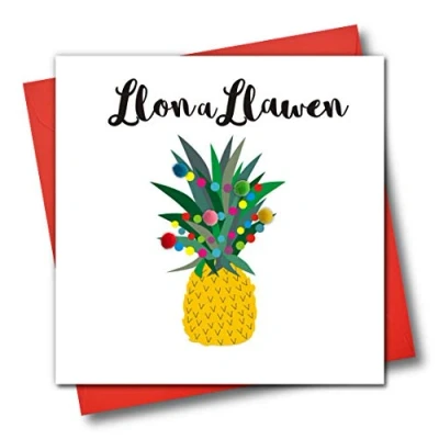DIMENSIONS: 150x150mm CAPTION: Llon a Llawen ENGLISH TRANSLATION: Merry & Bright EMBELLISHMENT: Colourful Pompoms BLANK INSIDE: Space inside for your own message MADE IN THE UK: Designed, printed and finished in the UK HIGH-QUALITY: Printed on top quality heavy 350gsm card stock, with envelope included SUSTAINABLE: Comes wrapped in Compostable bag or with a card catch label. Both the greetings card & envelope are sustainably sourced and recyclable STANDARD LETTER SIZE: Can be sent with Royal Mail standard letter stamps