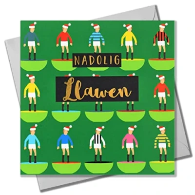 Claire Giles Greeting Cards, Welsh Happy Christmas card, Subbuteo and Santa hats design xmas Text Foiled in Shiny Gold