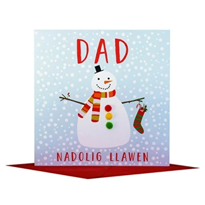 Claire Giles Greeting Cards, Welsh Happy Christmas Dad Card, Nadolig Llawen Dad, Snowman design xmas Embellished with Colourful Pompoms