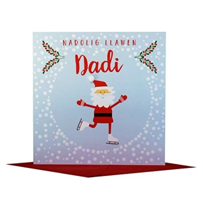Claire Giles Greeting Cards, Welsh Happy Christmas Daddy Card, Nadolig Llawen Dadi, Skating Santa Design Xmas Embellished with Colourful Pompoms