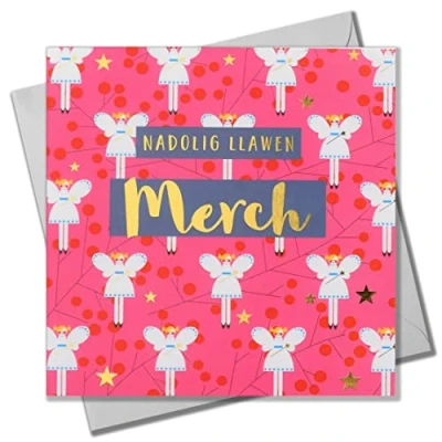 Claire Giles Greeting Cards, Welsh Happy Christmas Daughter Card, Nadolig Lawen Merch, Fairies on Pink design xmas Text Foiled in Shiny Gold