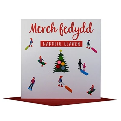 DIMENSIONS: 150x150mm CAPTION: Merch fedydd Nadolig Llawen ENGLISH TRANSLATION: Goddaughter, merry Christmas EMBELLISHMENT: Colourful Pompoms BLANK INSIDE: Space inside for your own message MADE IN THE UK: Designed, printed and finished in the UK HIGH-QUALITY: Printed on top quality heavy 350gsm card stock, with envelope included SUSTAINABLE: Comes wrapped in Compostable bag or with a card catch label. Both the greetings card & envelope are sustainably sourced and recyclable STANDARD LETTER SIZE: Can be sent with Royal Mail standard letter stamps