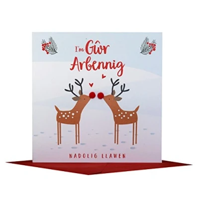 DIMENSIONS: 150x150mm CAPTION: I'm Gwr Arbennig, Nadolig Llawen ENGLISH TRANSLATION: Wonderful husband, happy Christmas EMBELLISHMENT: Colourful Pompoms BLANK INSIDE: Space inside for your own message MADE IN THE UK: Designed, printed and finished in the UK HIGH-QUALITY: Printed on top quality heavy 350gsm card stock, with envelope included SUSTAINABLE: Comes wrapped in Compostable bag or with a card catch label. Both the greetings card & envelope are sustainably sourced and recyclable STANDARD LETTER SIZE: Can be sent with Royal Mail standard letter stamps