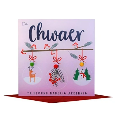 DIMENSIONS: 150x150mm CAPTION: i'm Chwaer yn dymuno Nadolig Arbennig ENGLISH TRANSLATION: To my sister, wishing you a wonderful Christmas EMBELLISHMENT: Colourful Pompoms BLANK INSIDE: Space inside for your own message MADE IN THE UK: Designed, printed and finished in the UK HIGH-QUALITY: Printed on top quality heavy 350gsm card stock, with envelope included SUSTAINABLE: Comes wrapped in Compostable bag or with a card catch label. Both the greetings card & envelope are sustainably sourced and recyclable STANDARD LETTER SIZE: Can be sent with Royal Mail standard letter stamps