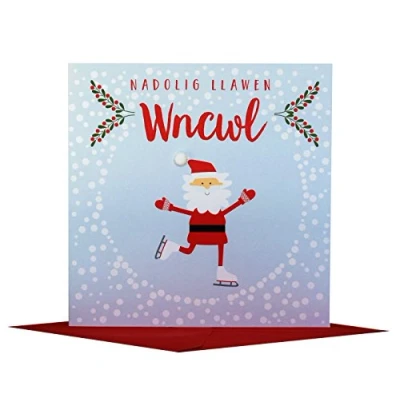 DIMENSIONS: 150x150mm CAPTION: Nadolig Llawen Wncwl ENGLISH TRANSLATION: Happy Christmas, uncle EMBELLISHMENT: Colourful Pompoms BLANK INSIDE: Space inside for your own message MADE IN THE UK: Designed, printed and finished in the UK HIGH-QUALITY: Printed on top quality heavy 350gsm card stock, with envelope included SUSTAINABLE: Comes wrapped in Compostable bag or with a card catch label. Both the greetings card & envelope are sustainably sourced and recyclable STANDARD LETTER SIZE: Can be sent with Royal Mail standard letter stamps