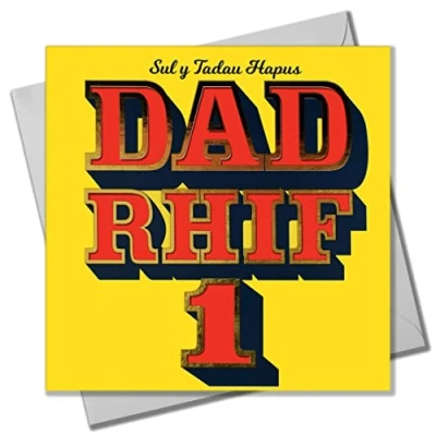 DIMENSIONS: 150x150mm CAPTION: Sul y Tadau Hapus, Dad Rhif 1 ENGLISH TRANSLATION: Top Dad, Happy Father's Day EMBELLISHMENT: Foil detail with Shiny Gold BLANK INSIDE: Space inside for your own message MADE IN THE UK: Designed, printed and finished in the UK HIGH-QUALITY: Printed on top quality heavy 350gsm card stock, with envelope included SUSTAINABLE: Comes wrapped in Compostable bag or with a card catch label. Both the greetings card & envelope are sustainably sourced and recyclable STANDARD LETTER SIZE: Can be sent with Royal Mail standard letter stamps
