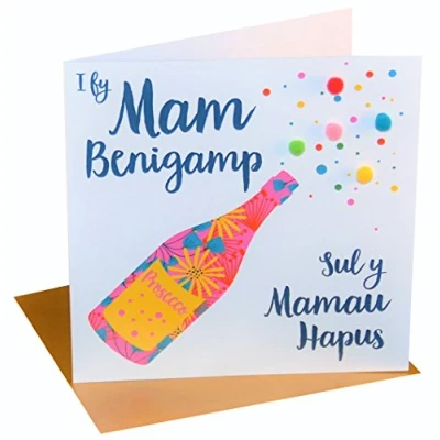 Claire Giles Greeting Cards, Welsh Happy Mother's Day Card, Sul y Mamau Hapus, Prosecco Mum Mothering Sunday Pompom Embellished