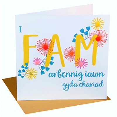 DIMENSIONS: 150x150mm CAPTION: I Fam arbennig iawn gyda chariad ENGLISH TRANSLATION: To a very special Mum with love EMBELLISHMENT: Colourful Pompoms BLANK INSIDE: Space inside for your own message MADE IN THE UK: Designed, printed and finished in the UK HIGH-QUALITY: Printed on top quality heavy 350gsm card stock, with envelope included SUSTAINABLE: Comes wrapped in Compostable bag or with a card catch label. Both the greetings card & envelope are sustainably sourced and recyclable STANDARD LETTER SIZE: Can be sent with Royal Mail standard letter stamps