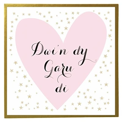 DIMENSIONS: 150x150mm CAPTION: Dwi'n dy Garu di ENGLISH TRANSLATION: I Love you BLANK INSIDE: Space inside for your own message MADE IN THE UK: Designed, printed and finished in the UK HIGH-QUALITY: Printed on top quality heavy 350gsm card stock, with envelope included SUSTAINABLE: Comes wrapped in Compostable bag or with a card catch label. Both the greetings card & envelope are sustainably sourced and recyclable STANDARD LETTER SIZE: Can be sent with Royal Mail standard letter stamps