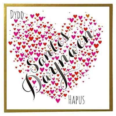 DIMENSIONS: 150x150mm CAPTION: Dydd Santes Dwynwen Hapus ENGLISH TRANSLATION: Will you be My Valentine BLANK INSIDE: Space inside for your own message MADE IN THE UK: Designed, printed and finished in the UK HIGH-QUALITY: Printed on top quality heavy 350gsm card stock, with envelope included SUSTAINABLE: Comes wrapped in Compostable bag or with a card catch label. Both the greetings card & envelope are sustainably sourced and recyclable STANDARD LETTER SIZE: Can be sent with Royal Mail standard letter stamps