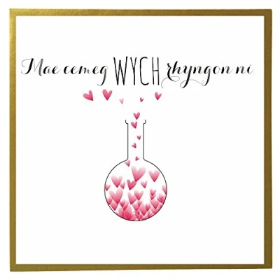 DIMENSIONS: 150x150mm CAPTION: Mae cemeg Wych Rhyngon ni ENGLISH TRANSLATION: We have Great Chemistry BLANK INSIDE: Space inside for your own message MADE IN THE UK: Designed, printed and finished in the UK HIGH-QUALITY: Printed on top quality heavy 350gsm card stock, with envelope included SUSTAINABLE: Comes wrapped in Compostable bag or with a card catch label. Both the greetings card & envelope are sustainably sourced and recyclable STANDARD LETTER SIZE: Can be sent with Royal Mail standard letter stamps