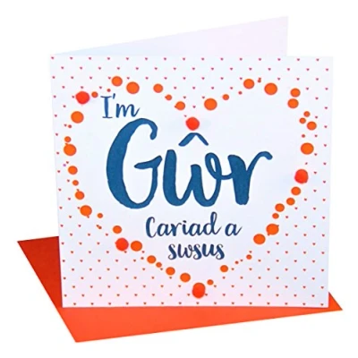 DIMENSIONS: 150x150mm CAPTION: I'm Gwr Cariad a swsus ENGLISH TRANSLATION: To my Husband, love & kisses on Valentine's Day EMBELLISHMENT: Colourful Pompoms BLANK INSIDE: Space inside for your own message MADE IN THE UK: Designed, printed and finished in the UK HIGH-QUALITY: Printed on top quality heavy 350gsm card stock, with envelope included SUSTAINABLE: Comes wrapped in Compostable bag or with a card catch label. Both the greetings card & envelope are sustainably sourced and recyclable STANDARD LETTER SIZE: Can be sent with Royal Mail standard letter stamps