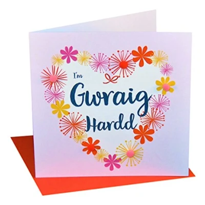 DIMENSIONS: 150x150mm CAPTION: I'm Gwraig Hardd ENGLISH TRANSLATION: Happy Valentine's Day, To my Beautiful Wife EMBELLISHMENT: Colourful Pompoms BLANK INSIDE: Space inside for your own message MADE IN THE UK: Designed, printed and finished in the UK HIGH-QUALITY: Printed on top quality heavy 350gsm card stock, with envelope included SUSTAINABLE: Comes wrapped in Compostable bag or with a card catch label. Both the greetings card & envelope are sustainably sourced and recyclable STANDARD LETTER SIZE: Can be sent with Royal Mail standard letter stamps