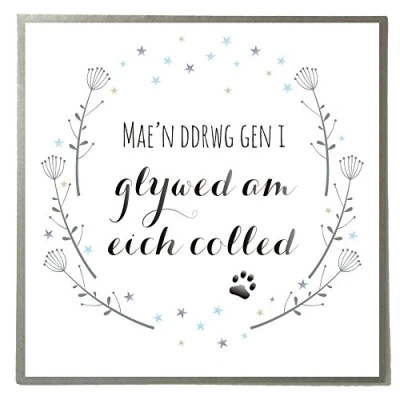 DIMENSIONS: 150x150mm CAPTION: Mae'n ddrwg gen i glywed am eich colled ENGLISH TRANSLATION: Sorry for the loss of your pet BLANK INSIDE: Space inside for your own message MADE IN THE UK: Designed, printed and finished in the UK HIGH-QUALITY: Printed on top quality heavy 350gsm card stock, with envelope included SUSTAINABLE: Comes wrapped in Compostable bag or with a card catch label. Both the greetings card & envelope are sustainably sourced and recyclable STANDARD LETTER SIZE: Can be sent with Royal Mail standard letter stamps
