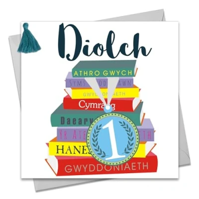 Claire Giles Greeting Cards, Welsh Thank You Teacher Card, Medal & Books design Very Much Tassel Embellished