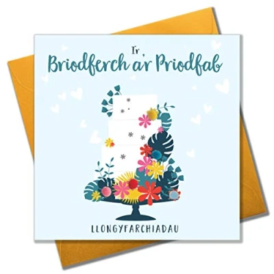 DIMENSIONS: 150x150mm CAPTION: I'r Briodferch a'r Priodfab Llongyfarchiadau ENGLISH TRANSLATION: Wedding EMBELLISHMENT: Colourful Pompoms BLANK INSIDE: Space inside for your own message MADE IN THE UK: Designed, printed and finished in the UK HIGH-QUALITY: Printed on top quality heavy 350gsm card stock, with envelope included SUSTAINABLE: Comes wrapped in Compostable bag or with a card catch label. Both the greetings card & envelope are sustainably sourced and recyclable STANDARD LETTER SIZE: Can be sent with Royal Mail standard letter stamps